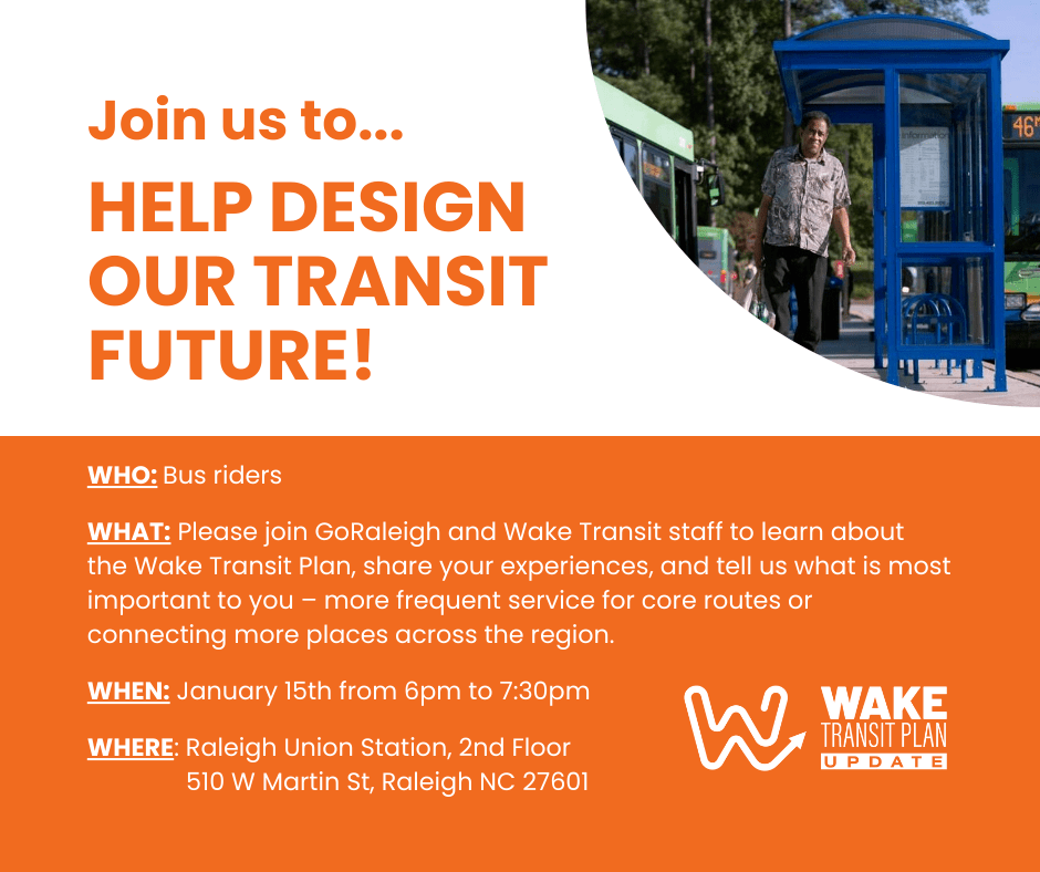 They need your input on these new ideas for regional connections and which projects should take priority. If you’re a regular transit rider, we’d love for you to join our Wake Transit staff for a focus group discussion. Here are the details for the meeting:
