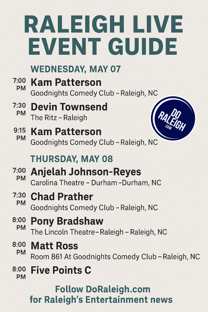 Looking for a reason to break up your week with some top-notch entertainment? Raleigh is bringing the heat this Wednesday and Thursday with a packed lineup of comedy, music, and more. Whether you’re into stand-up or live bands, there’s something happening that’ll get you out of the house and into the fun. Here’s your go-to guide for May 7–8: