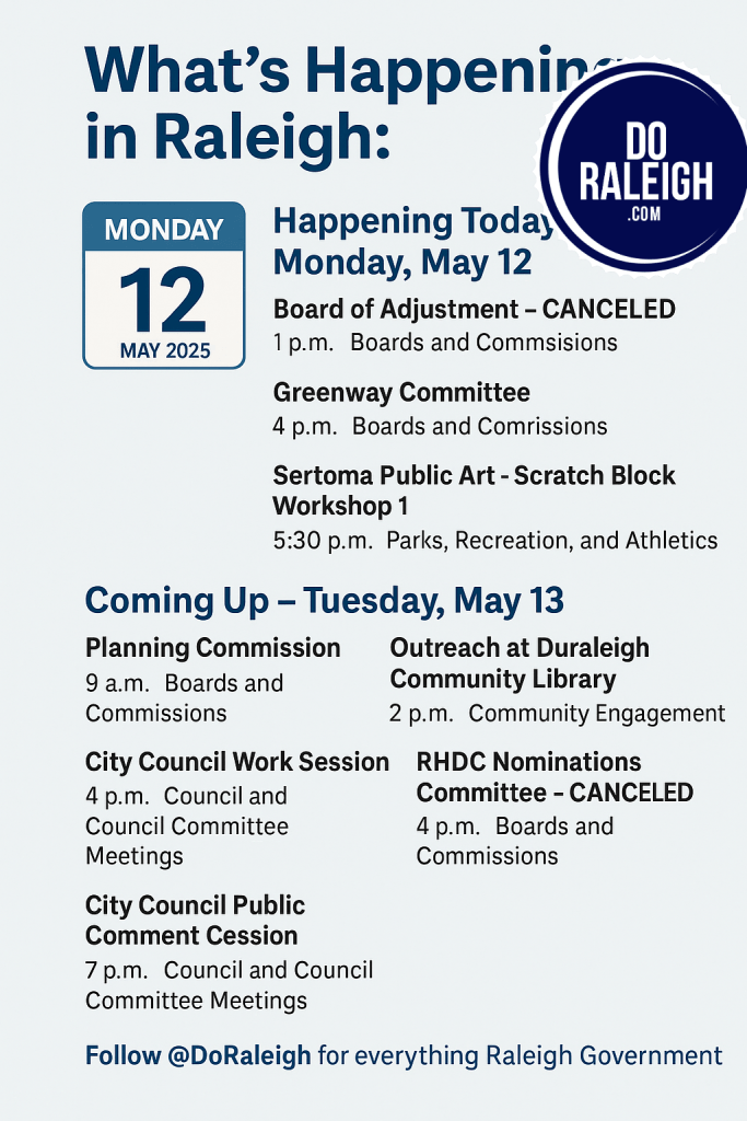 As the week begins, here’s a quick look at what’s happening around Raleigh in local government, arts, and community engagement. Whether you’re looking to get involved, stay informed, or attend a creative event, there’s something on the calendar for you.