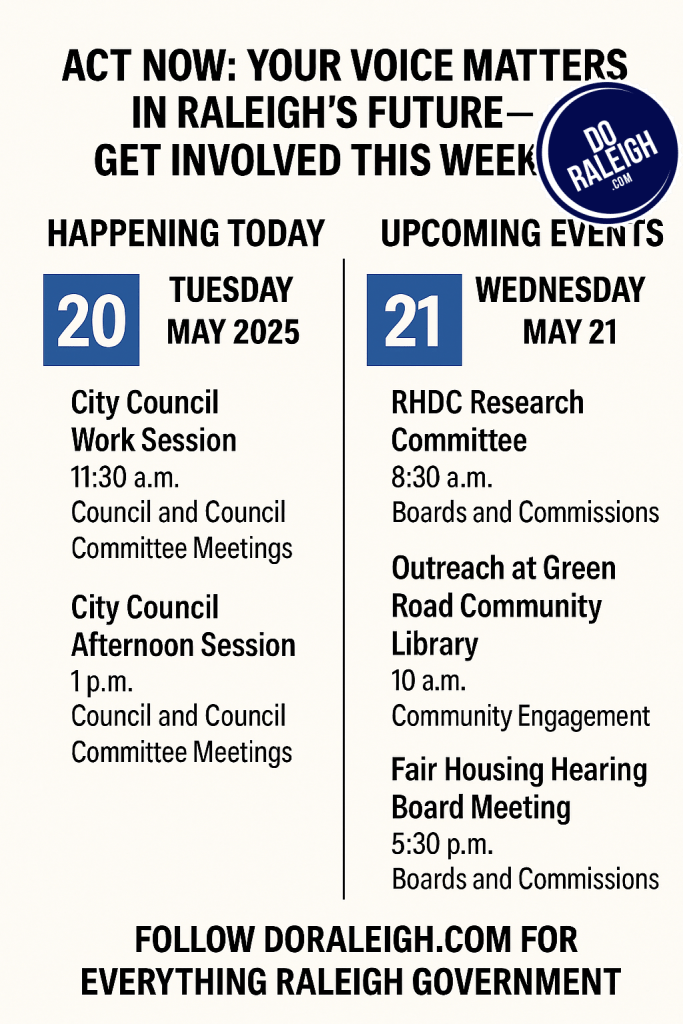 In a city as dynamic and fast-growing as Raleigh, every decision made at the local government level shapes our neighborhoods, infrastructure, and quality of life. That’s why this week’s events—happening today and tomorrow—deserve your attention and participation. Whether you’re a longtime resident or a newcomer eager to make your mark, now is the time to show up and speak out.