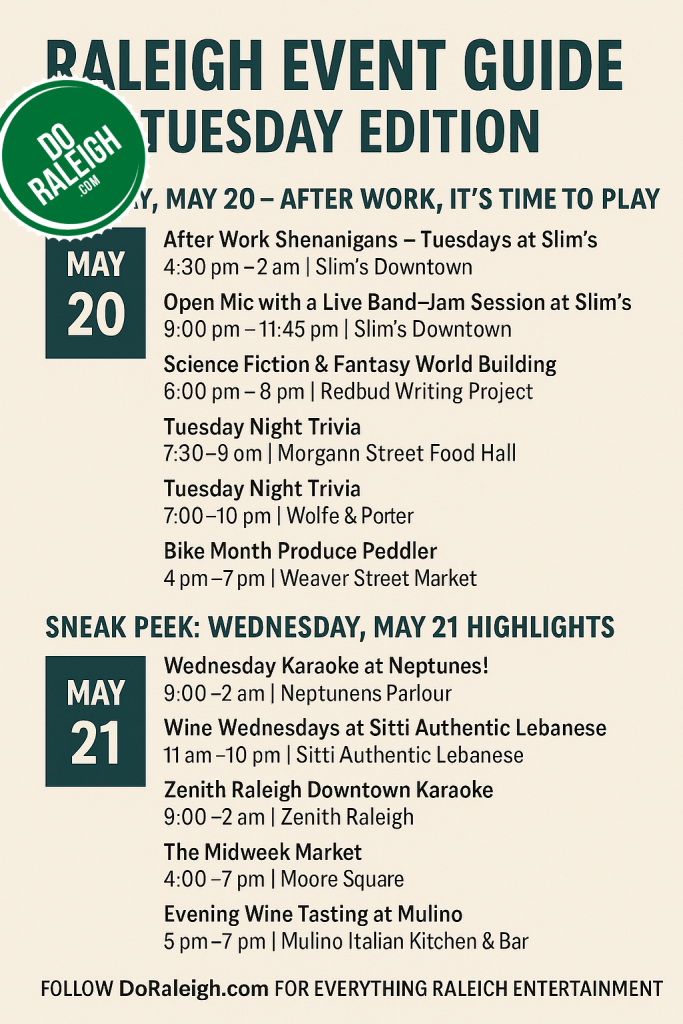 Looking to shake up your routine and dive into the best Raleigh has to offer? Whether you’re a trivia titan, a karaoke king, or just in the mood for great food and fresh air, Raleigh has a full slate of events this Tuesday and Wednesday to keep you energized and entertained.