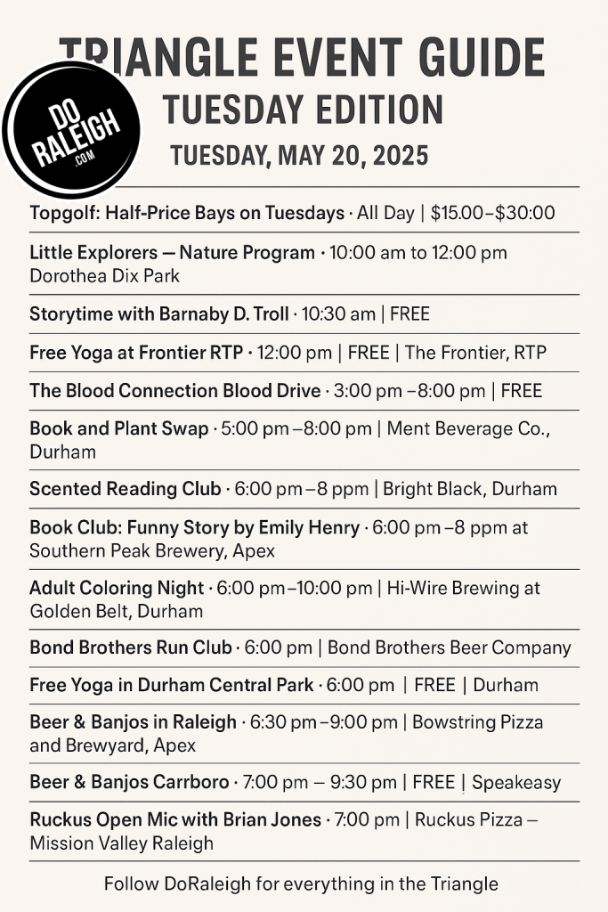 Tuesdays in the Triangle aren’t just a break between Monday’s hustle and Wednesday’s halfway mark—they’re a vibe. Whether you’re looking to chill with a good book, stretch it out with yoga, hear live music, or enjoy open mic energy, Tuesday, May 20, 2025 is stacked with fun, free, and low-cost events across Durham, Raleigh, Cary, Carrboro, and beyond.