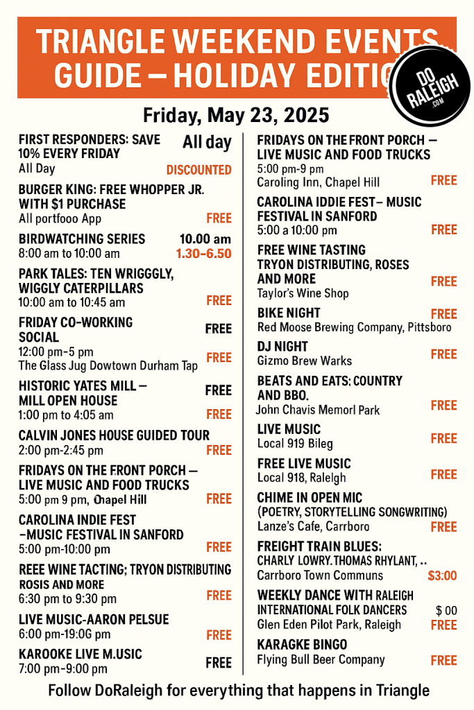 The Triangle is turning up the fun this holiday weekend with an incredible lineup of free and low-cost events to kick off your Friday in style. From early-morning birdwatching to late-night karaoke, there’s something for everyone—families, foodies, music lovers, and more!