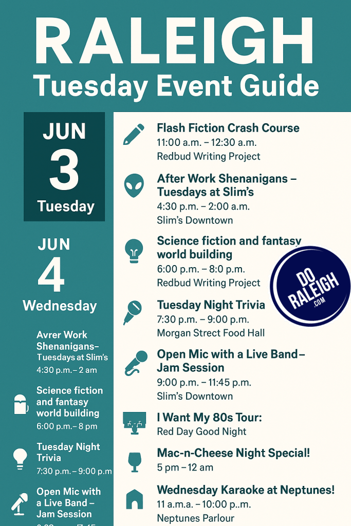 Tuesday doesn’t have to mean boring. In Raleigh, June 3 is packed with events that bring together live music, writing workshops, trivia, and after-hours fun. Whether you’re into fantasy fiction or food hall facts, there’s something happening in town to make your Tuesday anything but ordinary.