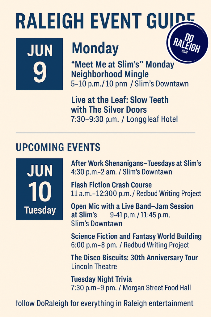 Welcome to your Monday edition of the Raleigh Event Guide, where we help you start your week right with the best of the city’s local happenings. Whether you’re looking for laid-back mingling, live music, or something to bookmark for Tuesday, we’ve got you covered.
