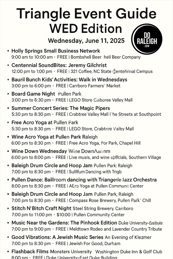 The middle of the week doesn’t have to mean a midweek slump—especially not in the Triangle! From Holly Springs to Durham, Raleigh to Chapel Hill, this Wednesday, June 11, the region is bursting with free and low-cost events that bring together creativity, community, and culture.