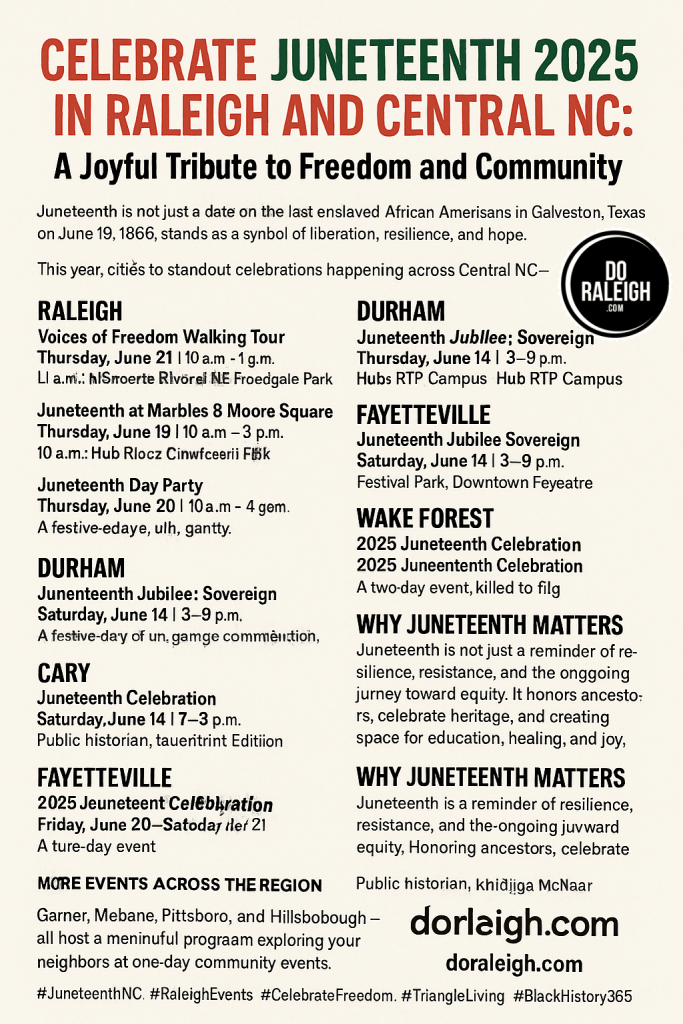 As summer unfolds, Central North Carolina is gearing up to celebrate Juneteenth 2025 with passion, purpose, and pride. Juneteenth, commemorating the emancipation of the last enslaved African Americans in Galveston, Texas on June 19, 1865, stands as a symbol of liberation, resilience, and hope. This year, cities across the Triangle and beyond are offering a vibrant mix of educational events, cultural celebrations, music, food, and family-friendly fun.