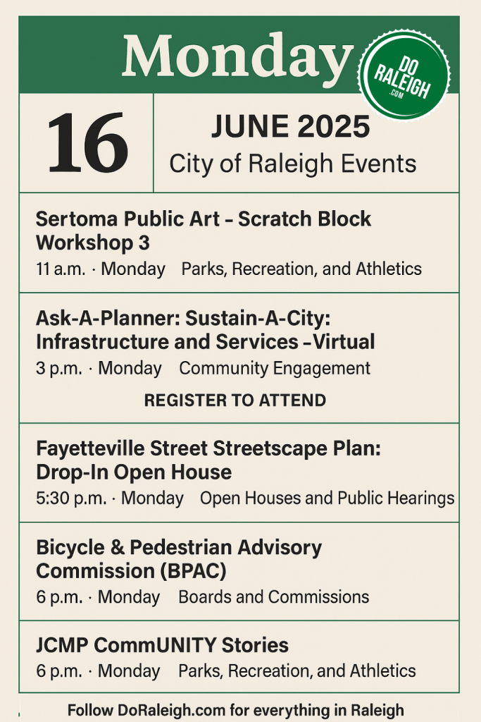 Looking to kick off your week with inspiration, creativity, and community connection? The City of Raleigh has a full lineup of official events this Monday, June 16, 2025, ranging from hands-on workshops and public planning sessions to community storytelling and commission meetings. Whether you’re passionate about the arts, sustainability, urban planning, or civic engagement, there’s something for everyone.