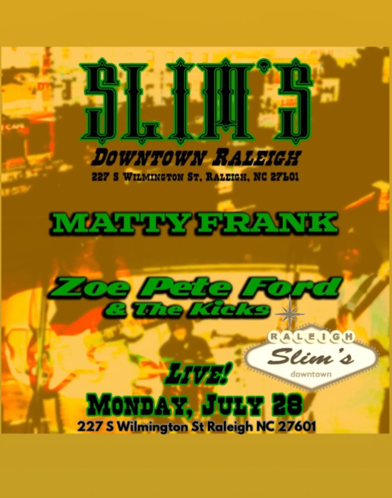 Date & Time: Monday, July 28, 2025 | 9:00 p.m. – 11:00 p.m. Location: Slim’s Downtown, 227 S. Wilmington St, Raleigh, NC Featuring: Zoe Pete Ford • Matty Frank • The Boots